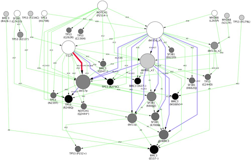 A graph representing the sequence of genomic alterations in chronic lymphocytic leukemia (CLL). Each node represents a mutation, with arrows indicating temporal relationships between them. The size of the nodes indicates the number of patients in the study who exhibited the alteration, while the thickness of the lines shows how often the temporal relationships between nodes were seen. The method the researchers use enabled them to identify multiple, distinct evolutionary patterns in CLL.